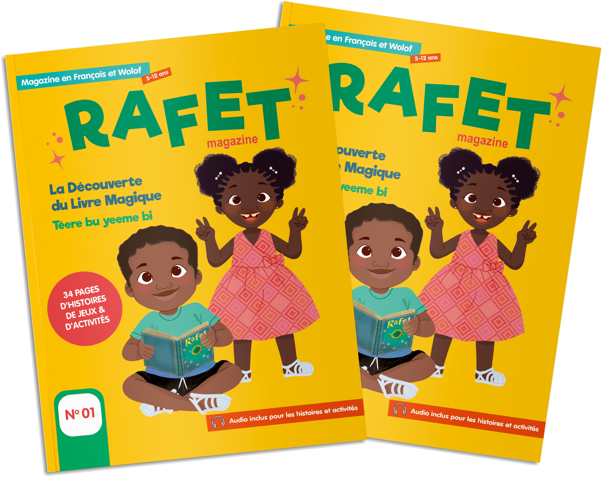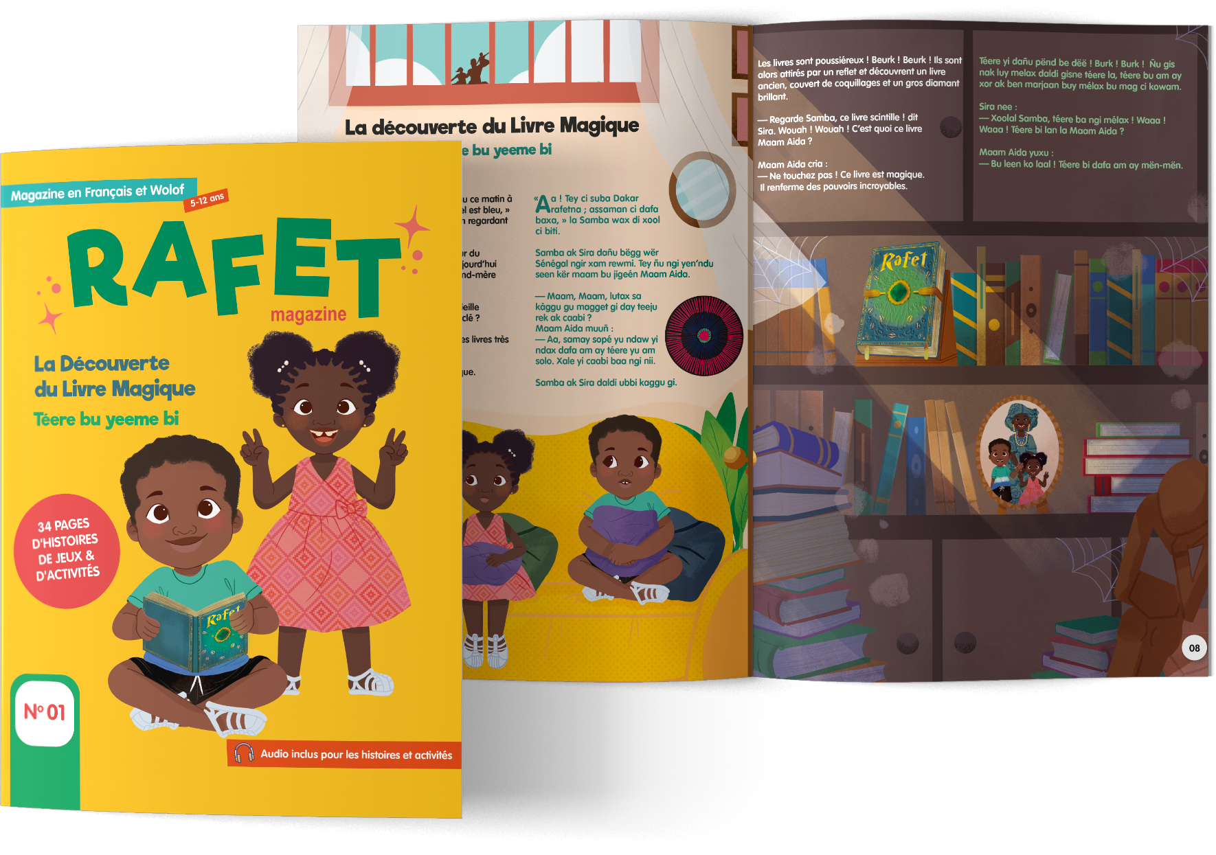 Dans cette première aventure de RAFET Magazine, partez à la découverte de Dakar aux côtés de deux enfants curieux et courageux, Sira et Samba. Alors qu’ils explorent la bibliothèque de leur grand-mère, ils tombent sur un livre mystérieux : le Livre Magique RAFET. Mais que renferme réellement ce livre incroyable, rempli de pouvoirs cachés ? En tournant les pages, vous serez plongés dans un univers d'énigmes, de jeux et d'histoires captivantes qui vous permettront d’en apprendre plus sur la culture et la langue wolof. Quelles aventures attendent Sira et Samba ? Quels secrets vont-ils découvrir ?